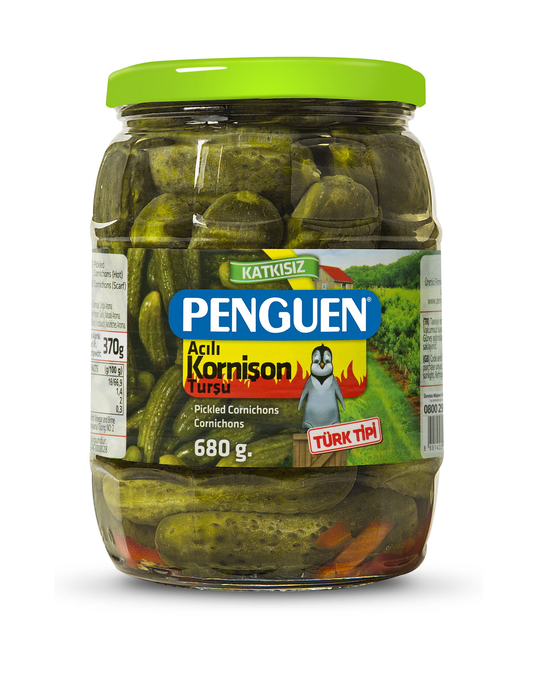 Penguen’in tüm ürünlerinde olduğu gibi % 100 katkısız ve % 100 doğal olarak üretilen Acılı Kornişon Turşu sayesinde hem turşu hem de acı sevenler iki keyfi bir arada yaşayacaklar.