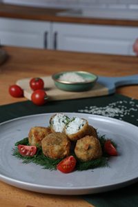 - Pirinç toplarını önce una, sonra yumurtaya, sonra da pankoya batırın ve kızgın yağda kızartın.