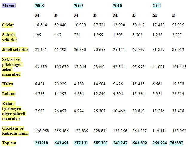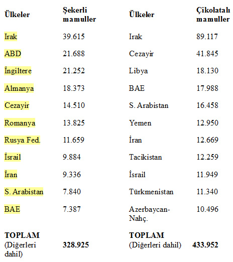 Kaynaklar: * TC Ekonomi Bakanlığı, İhracat Genel Müdürlüğü-Şekerli ve çikolatalı mamuller sektör raporu * Şekerli Mamul Sanayicileri Derneği (ŞEMAD)