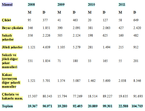 Türkiye’ye ithal edilen şekerli ve çikolatalı mamullerin büyük bir kısmı Avrupa Birliği ülkelerinden gerçekleştirilmekte ve ithalatın % 88’ini çikolatalı mamuller, % 12’sini ise şekerli mamuller oluşturmaktadır. 2011 yılında toplam şekerli mamuller ithalatı % 29 artış gösterirken, toplam çikolatalı mamuller ithalatı % 2,7 artış göstermiştir.