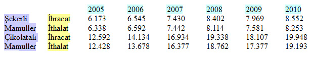 İthalat: Türkiye şekerli ve çikolatalı mamuller sektörü ana ham maddelerinden birisi olan kakao açısından ithalata bağımlı bir sektördür.